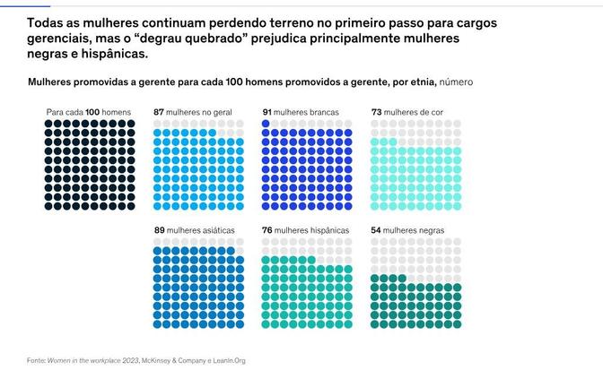 Segundo o relatório Women in the workplace, da McKinsey & Company, as mulheres negras em estágios iniciais de carreira enfrentam desafios persistentes na progressão profissional. Apesar de uma breve melhoria em 2020 e 2021, onde a taxa de promoção atingiu seu auge de 96 mulheres negras promovidas para cada 100 homens, houve uma queda significativa em 2023, retornando aos níveis de 2018, com apenas 54 mulheres negras promovidas para cada 100 homens. [Acesse o relatório completo]